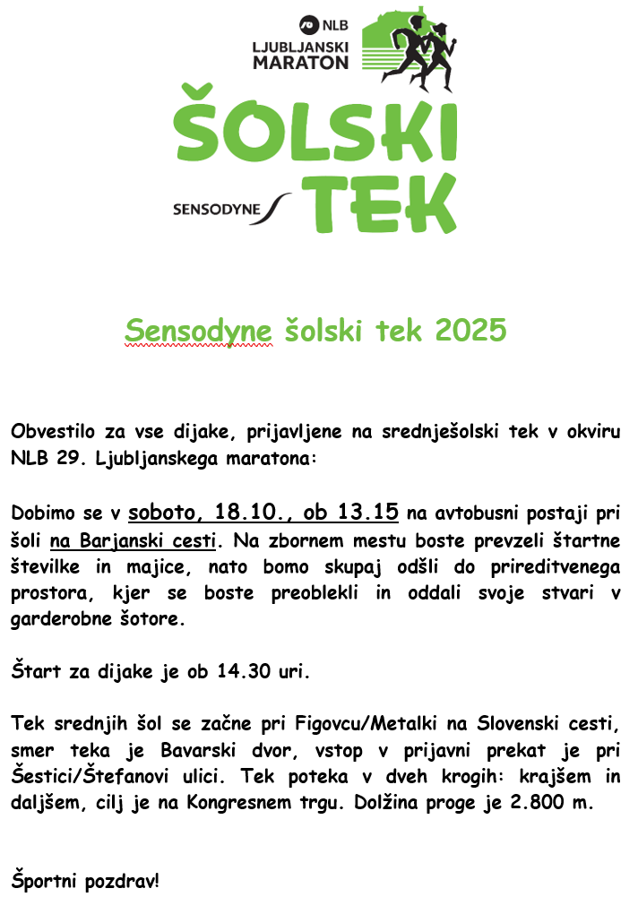 Srednja lesarska šola organizira v petek, 12. 12. 2025 , drugi športni dan v tem šolskem letu. Izvedene bodo naslednje dejavnosti: 1. POHOD v okolici šole (Aškerčeva – pot Ob žici – Koseze – Mostec – Cankarjev vrh - Tivoli - Aškerčeva) ZBOR: 9.00 na šolskem dvorišču Pohod bo dolg približno 4 šolske ure. Obvezna je primerna zimsko-športna obutev z nazobčanim podplatom in primerna oblačila! S seboj imejte malico in vodo v plastenki. Profesorji spremljevalci : Franci Novak, Simon Slabe, Luka Baloh, Florjan Štigl, Anže Potrebuješ 2 . VODNE AKTIVNOSTI v ATLANTISU (BTC City Ljubljana) LPP št. 2, 7, 12, 24, 27 ZBOR: 8.30 pred Vodnim centrom ATLANTIS TRAJANJE DEJAVNOSTI: do 11.00 Dejavnost poteka pod vodstvom animatorjev. S seboj imejte kopalno opremo (kopalke, brisača, natikači). Dejavnost se plača pred začetkom, zato morate imeti denar (16 EUR) s seboj! Profesorji spremljevalci: Asta Mramor, Barbara Rupnik, Simon Avbreht, Urban Kompolšek, Miro Uršič 3. BOWLING (Klub 300 v Kosezah, Regentova 35 Ljubljana) LPP št.7, 7L Pred vhodom v Klub 300 v Šiški se zberemo ob: - 1. Skupina ( 3A, 3B, 3C, 3Č, 3D, 4B, 1K, 1L ) ob 7.30. TRAJANJE DEJAVNOSTI: do 10.00. Profesorji spremljevalci : Gabi Dolenšek, Matej Susman, Bernarda Jernejc, Ivo Koderman, Urška Wertl, Barbara Terpin, Marjan Grah, Erika Potrebuješ - 2. Skupina ( 1A, 1B, 1C, 1D, 2A, 2B, 2G ) ob 9.30. TRAJANJE DEJAVNOSTI: do 12.00. Profesorji spremljevalci: Jože Planinšič, Tadej Krivic, Lane Vukadinović, Grega Štendler, Tomaž Purkart, Jože Babič, Boštjan Hrovat, Andrej Černe Pred začetkom boste dobili ustrezno obutev in navodila, potem pa se boste razdelili v skupine po stezah. Na posamezni stezi je po 6 igralcev, zato se že vnaprej dogovorite za razporeditev, da ne boste izgubljali dragocenega časa za igro! Dejavnost se plača pred začetkom, zato morate imeti denar (11 EUR) s seboj! 4. BOWLING + PIXEL GAMES (WOOP! Arena, BTC Ljubljana) LPP št. 2, 7, 12, 24, 27 ZBOR: 8.00 pred WOOP! Areno TRAJANJE DEJAVNOSTI: do 11.30 Pred začetkom boste dobili ustrezno obutev in navodila, potem pa se boste razdelili v skupine po stezah oziroma za igranje Pixel Games. Vsi udeleženci si obvezno preberite izjavo o odgovornosti, ki je dostopna na povezavi: https://woop.fun/izjava-o-odgovornosti/ . Dejavnost se plača pred začetkom, zato morate imeti denar (14 EUR) s seboj! Profesorji spremljevalci: Tatjana Novak, Špela Grum, Blaž Arko, Manuela Polanc, Jože Šemrov, Sebastijan Pagon 5. SQUASHLAND (Pesarska cesta 8, Ljubljana) LPP št.5, 9, 13 ZBOR: 11.30 pred vhodom v SQUASHLAND TRAJANJE DEJAVNOSTI: do 14.30 Program zajema naslednje dejavnosti v manjših skupinah: Squash, WallyBall, Funkcionalne vadbe, Floorball, Just dance plesna igra. S seboj imejte športno opremo in čiste dvoranske športne copate. Dejavnost se plača pred začetkom, zato morate imeti denar (14 EUR) s seboj! Profesor spremljevalec: Gregor Kranjec 6. ŠAH Dijaki ki ste opravičeni športne vzgoje boste prišli v šolo. Zbor za igranje šaha bo ob 8.00 uri pred zbornico ! Vodja dejavnosti: Manca Kavčič Strošek dejavnosti BOWLING / PIXEL GAMES, SQUASHLAND, vodne aktivnosti v ATLANTISU in BOWLING v Klubu 300 boste poravnali pred samim začetkom, zato razredni blagajniki pred pričetkom zberite denar in poravnate vstopnico za vse prijavljene iz razreda na blagajni. Malico boste lahko prevzeli v šolski jedilnici pred pričetkom dejavnosti, v nasprotnem primeru se pravočasno odjavite. Športni dan je obvezna izbirna vsebina in se upošteva tako kot vsak drug šoloobvezni dan. Razredi 2k in 2l imajo praktični pouk pri naslednjih učiteljih: Gregor Virant, Stane Lemut, Boris Drnovšek, Ingo Kuralt Razred 1G ima praktični pouk pri naslednjih učiteljih: Gorazd Cizelj, Boštjan Janša Vsi imajo pouk v dopoldanskem času.