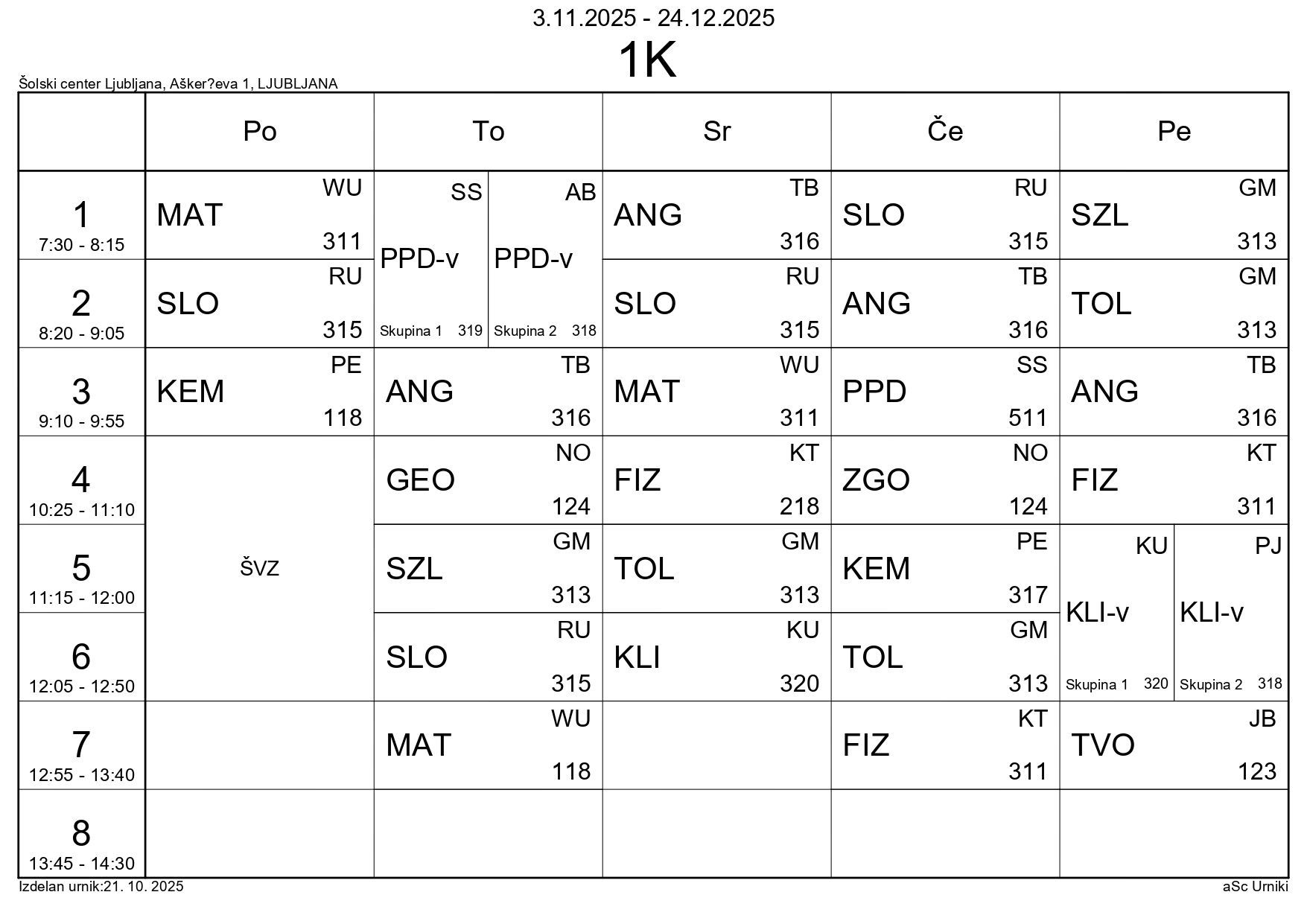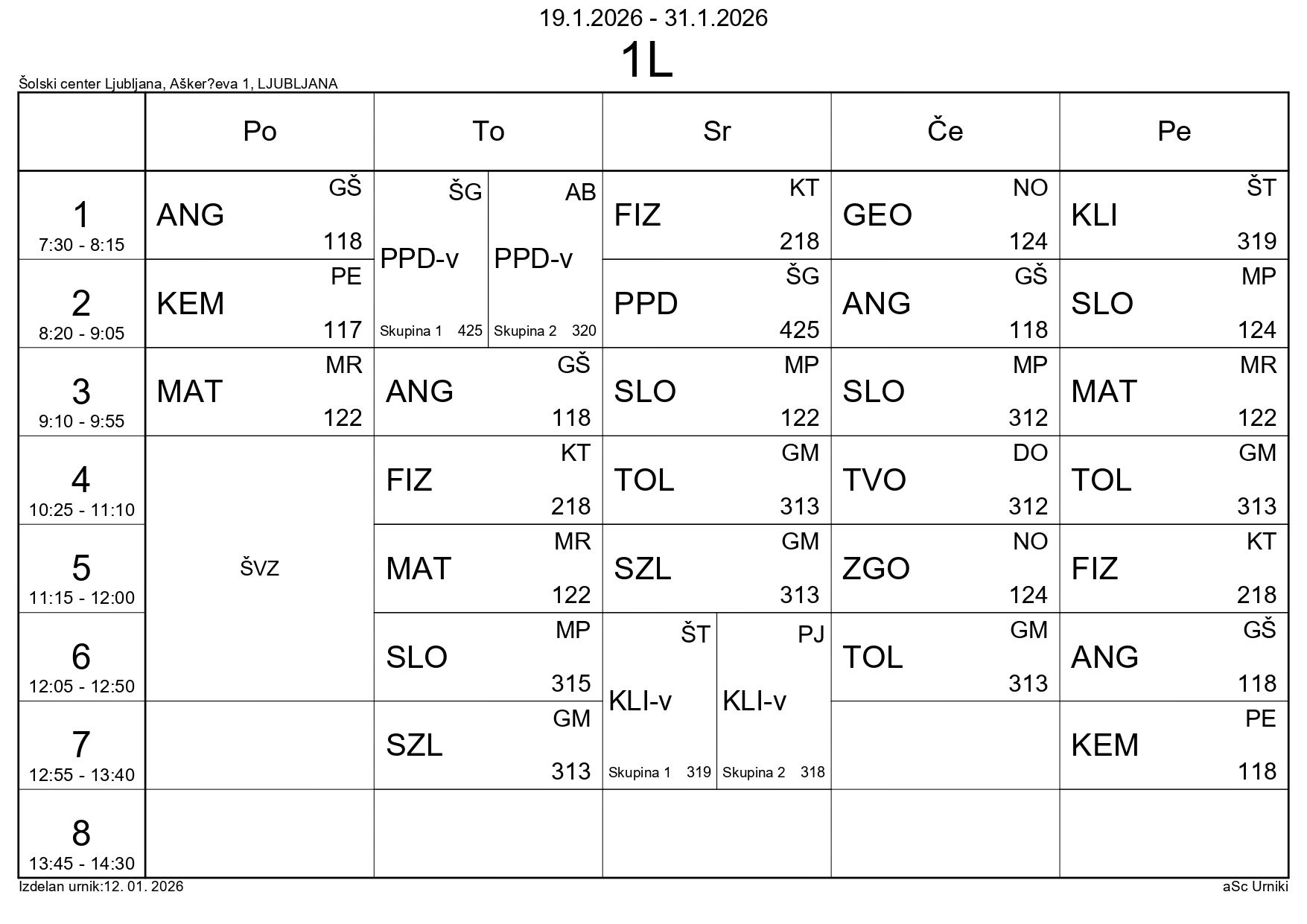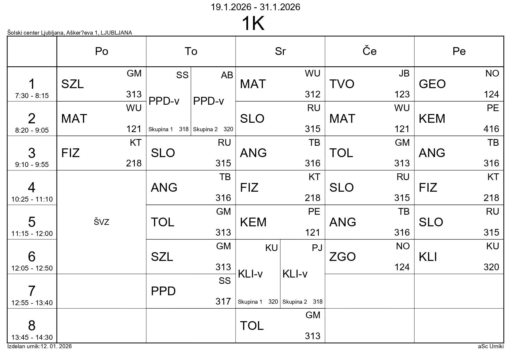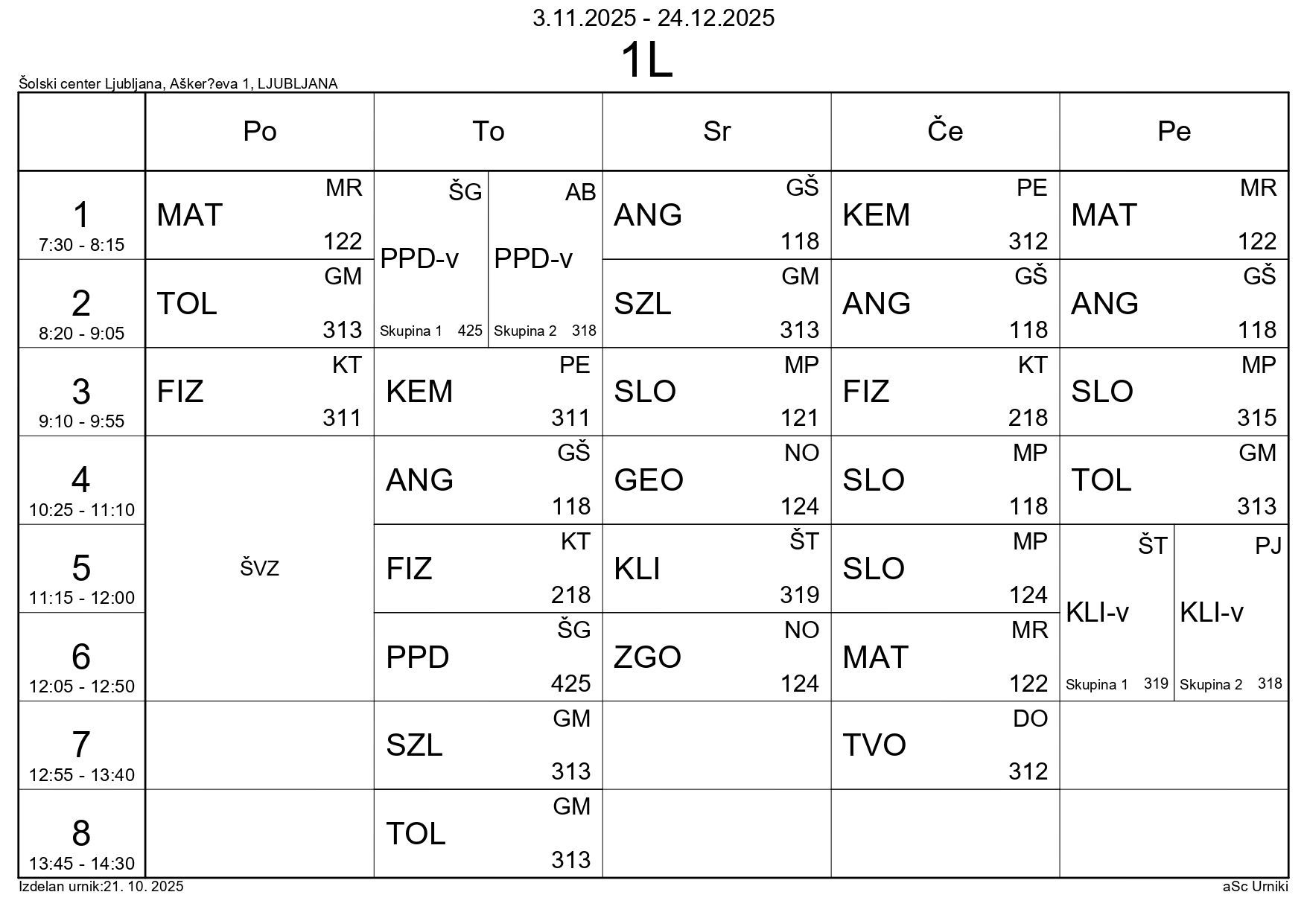 Pouk poteka le v dopoldanski izmeni. Večji del pouka se izvaja v specializiranih učilnicah. Pouk športne vzgoje poteka v šolski telovadnici in v najetih športnih dvoranah.