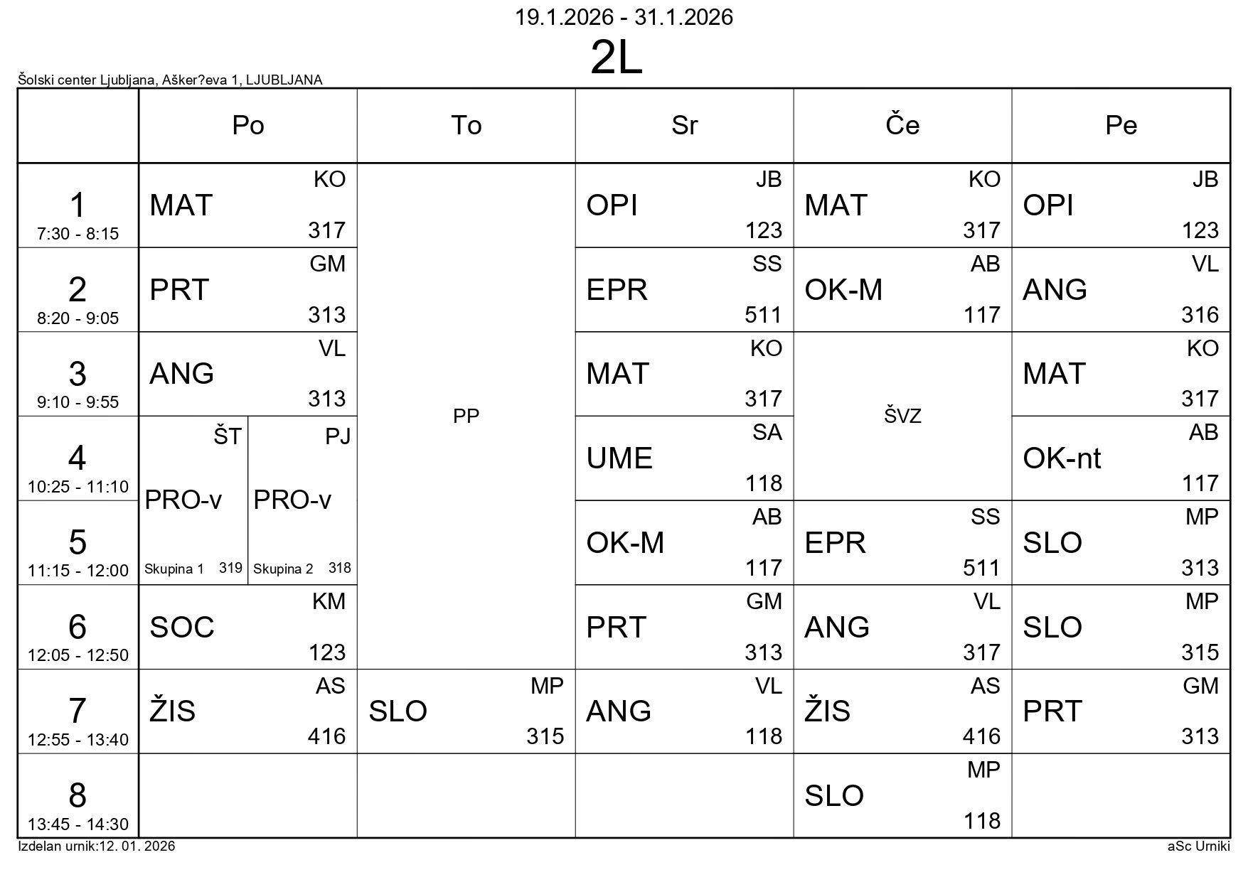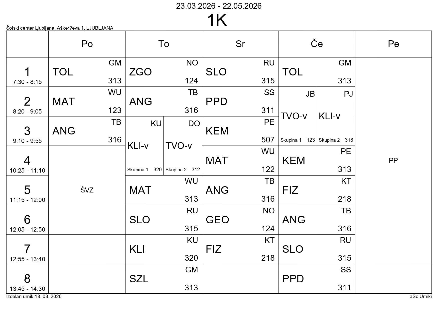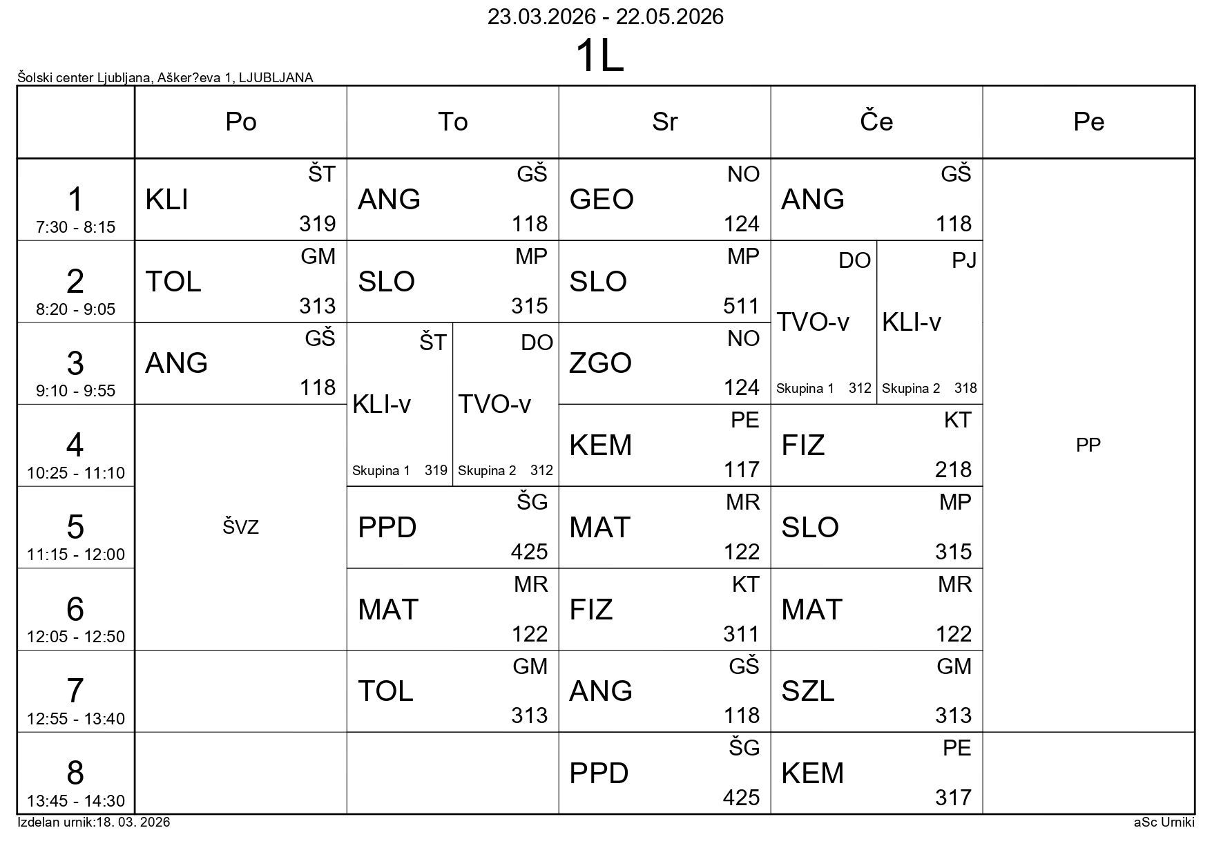 Pouk poteka le v dopoldanski izmeni. Večji del pouka se izvaja v specializiranih učilnicah. Pouk športne vzgoje poteka v šolski telovadnici in v najetih športnih dvoranah.