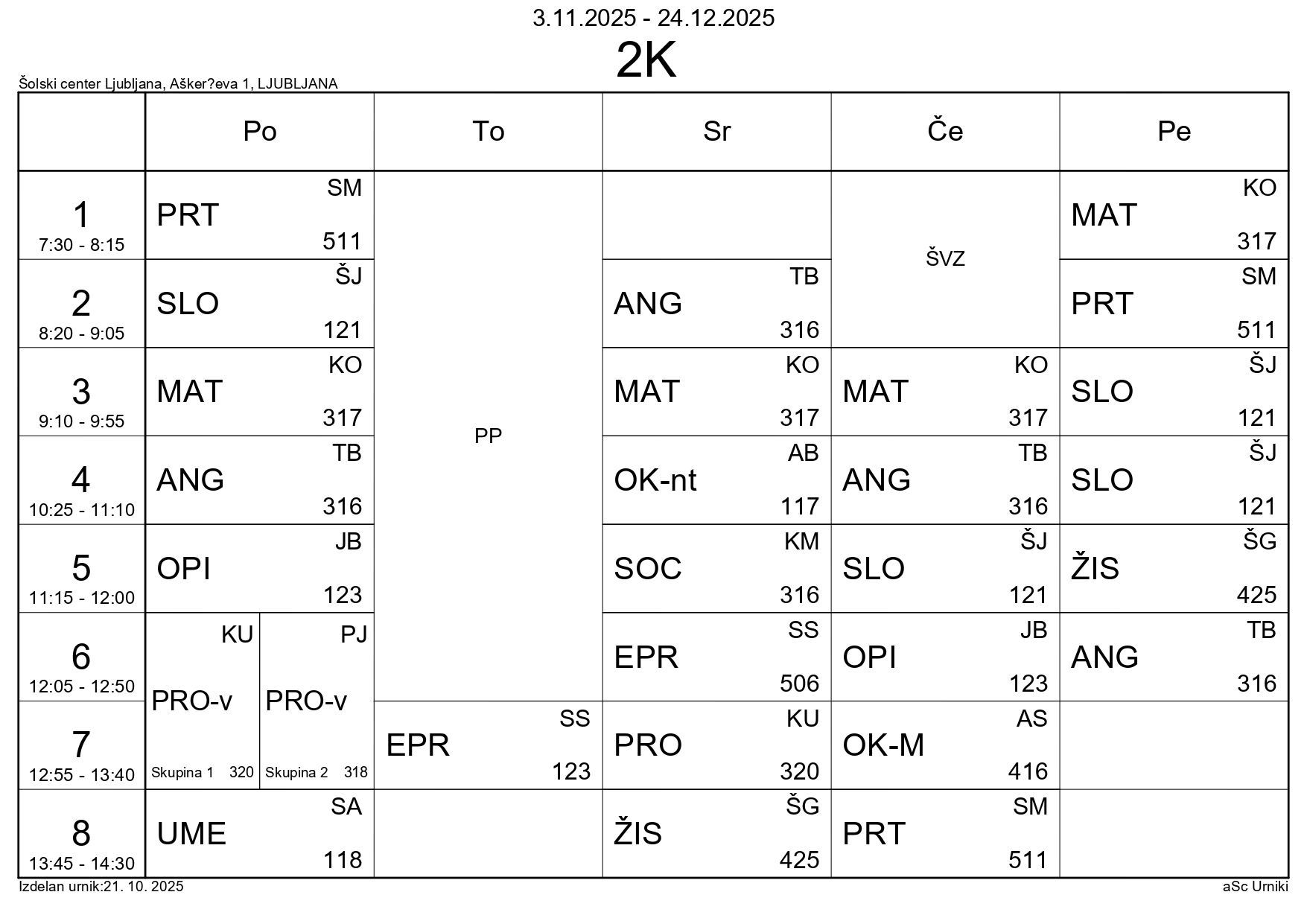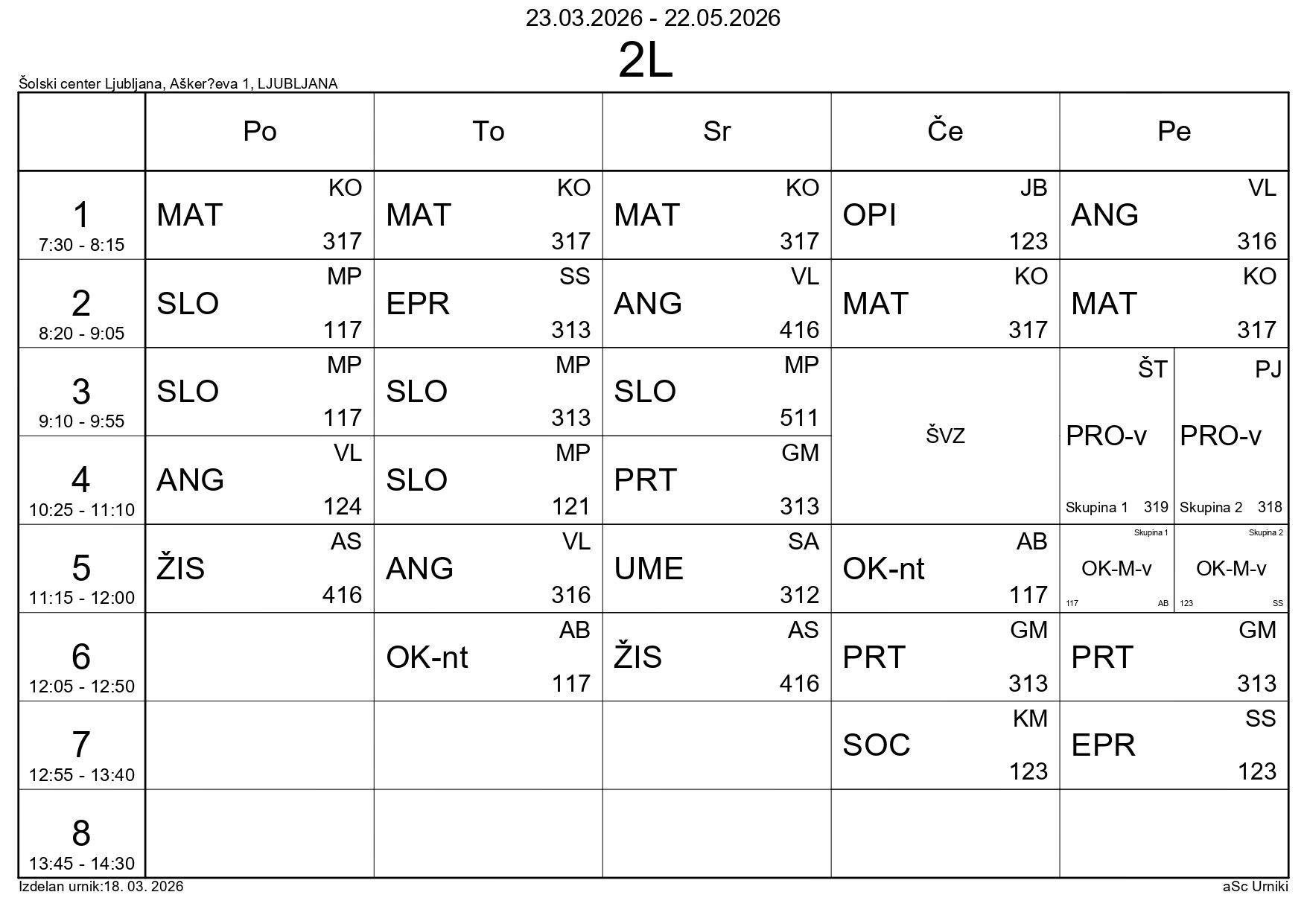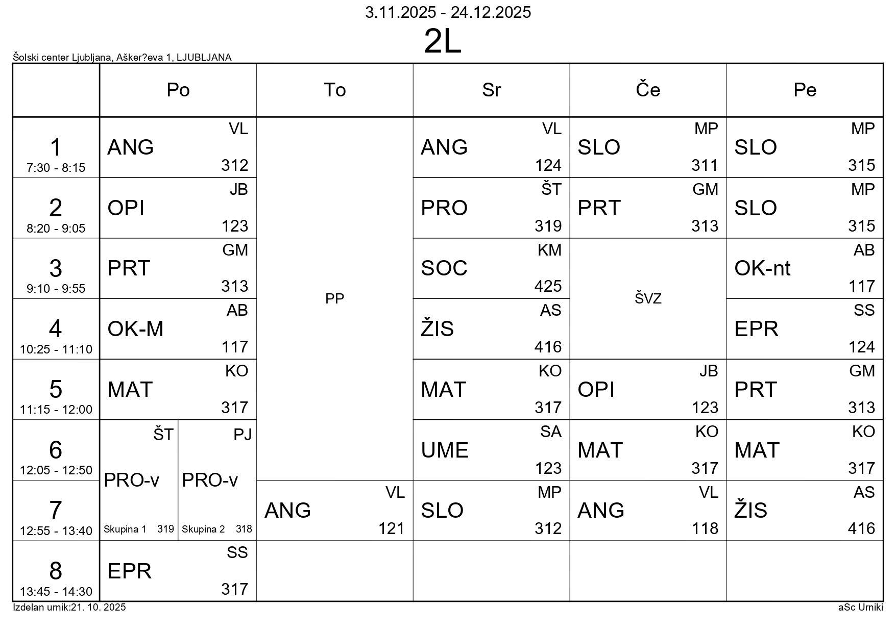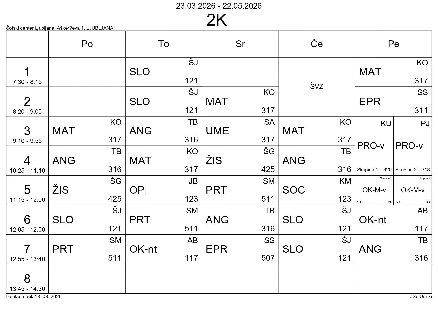 Pouk poteka le v dopoldanski izmeni. Večji del pouka se izvaja v specializiranih učilnicah. Pouk športne vzgoje poteka v šolski telovadnici in v najetih športnih dvoranah.